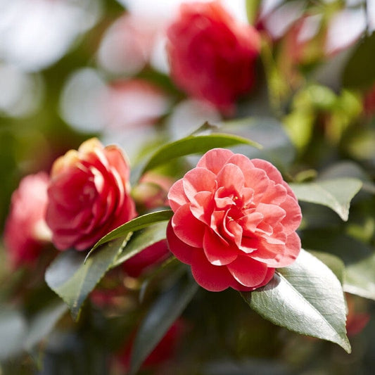 - Gradated pink double blooms, evergreen leaves