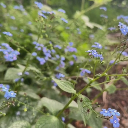 - Low growing silvery foliage covered in forget-me-not blue flowers